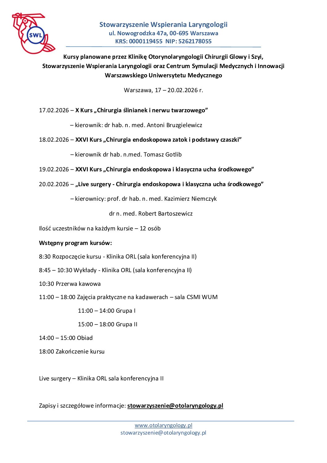 Zapraszamy do zapisów na kolejną edycję kursów kadawerowych prowadzonych w Klinice Otorynolaryngologii Chirurgii Głowy i Szyi WUM, które odbędą się w dniach 17 – 20 luty 2026 r.